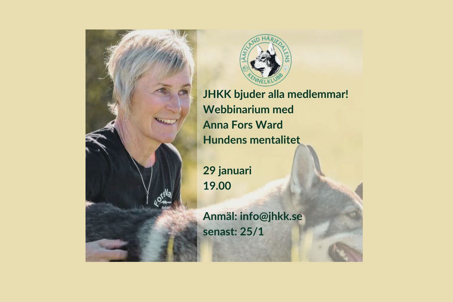 FöreläsningJHKK bjuder in alla medlemmar till ett intressant och viktigt webbinarium med Anna Fors Ward som pratar om Hundens mentalitet! Gratis för JHKK:s medlemmar!