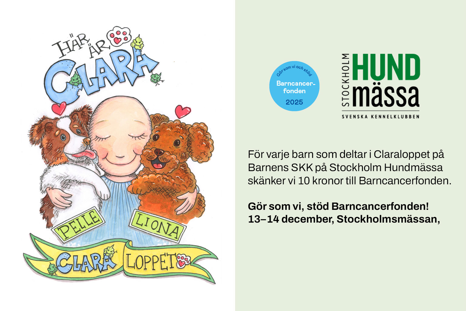 NyheterFör första gången har vi en insamling till Barncancerfonden – och du kan vara med och göra skillnad! Genom att på Stockholm Hundmässa delta i Clara-loppet eller besöka Barnens SKK bidrar du till hopp och stöd för barn som kämpar mot cancer.