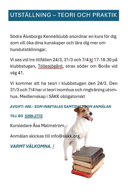 Utställning - teori och praktik Kurs & Utbildning Passa på att gå denna utställningskurs! Händelsedetaljer Datum 24 mars 2026 Tid 17:00 - 18:30 Plats eller digitalt Töllesjö Gård