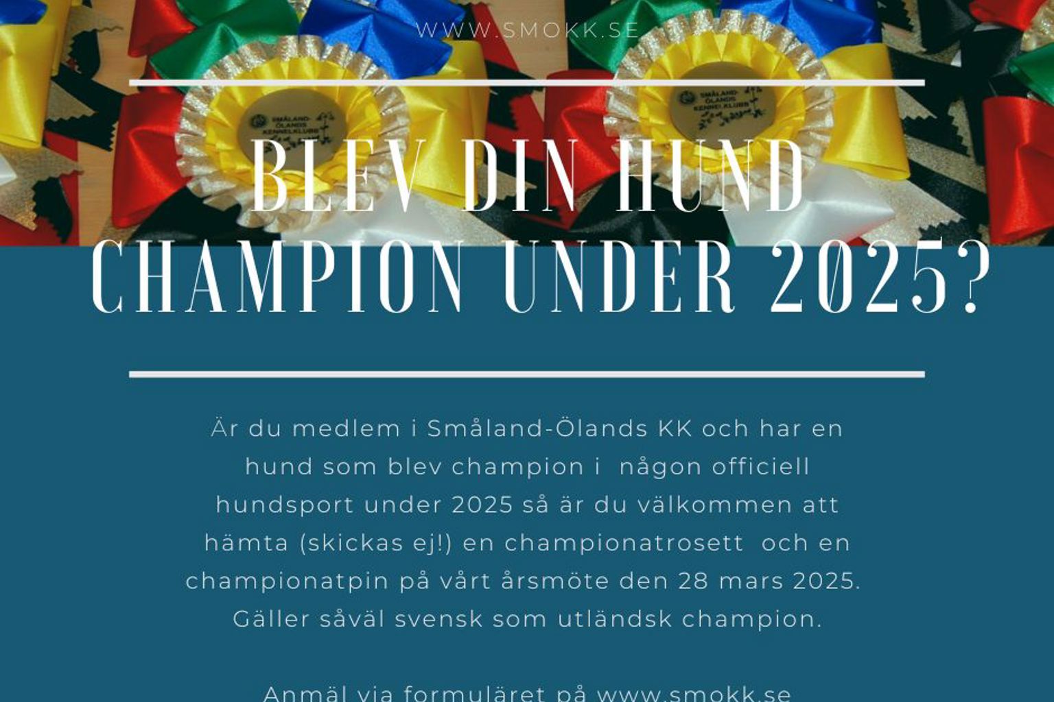 Grattis! Alla medlemmar vars hundar erhållit ett championat i någon officiell hundsport under 2025 är välkomna att hämta en championatrosett och en pin på årsmötet. Gäller såväl svensk som utländsk champion.